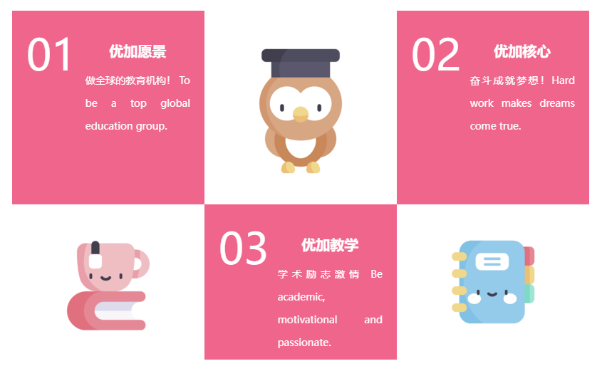 优加青少英语专注于青少英语教育及胜任力的培养,从视野、硬能力(英语能力与人文科技素养)、软实力(国际人才核心素养4C)和中国根基几方面来构建青少年胜任力培养体系。采用The APPB Approach(APPB:The Activity-,Project-,Problem-, Based Approach)教学法,基于活动参与(Activity)、基于项目完成(Project)和基于解决问题(Problem)的学习目标来设置教学流程,通过英语学习实现育人目标。